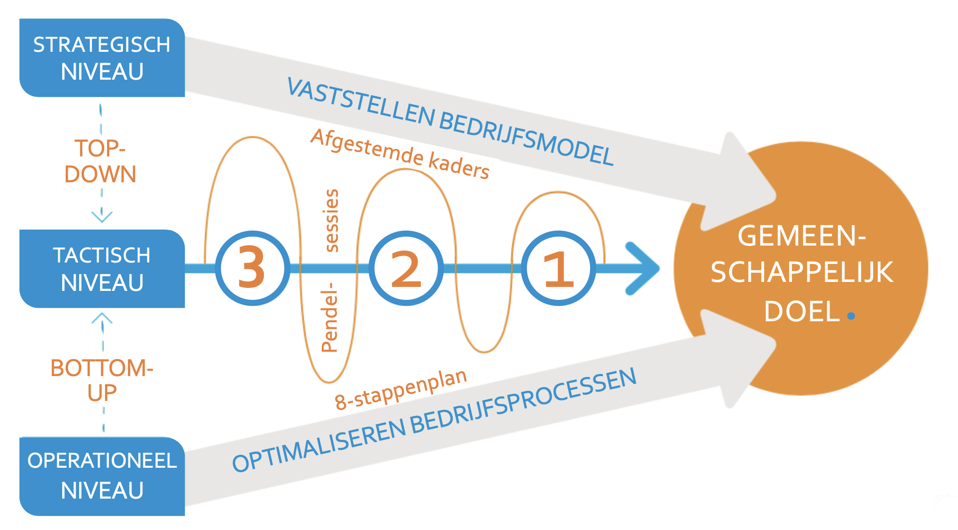 De relaties tussen de verschillende processen wordt vervolgens in het bovenliggende ‘Bedrijfsmodel’ weergegeven. Hierin staan meestal zowel de primaire, ondersteunende als verbeterprocessen. Met het ‘Bedrijfsmodel’ hebben medewerkers een compleet overzicht van alle processen en hun onderlinge samenhang!